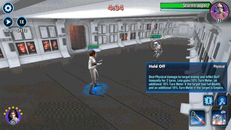 Base: Leia has +30% Tenacity. The first time each turn Leia Resists a detrimental effect or suffers a debuff she gains 5% Turn Meter.