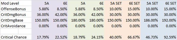 For the orange case, lets assume we had two identical mod sets, except one is a Critical Damage set bonus and the other has an Offense set bonus and you do not have a critical damage primary on the triangle. All of the other stats and bonuses on all your other mods are the same. Currently with 5A mods, if your critical chance is above 40%, it is on average better to use a Critical Damage set than an Offense set. If we upgraded both of these sets to 6E mods, then your critical chance would have to be higher than 66.67% for the critical damage set to yield more damage, otherwise the offense set would be better. The final blue case repeats the orange case, but assuming you do have a CD triangle.