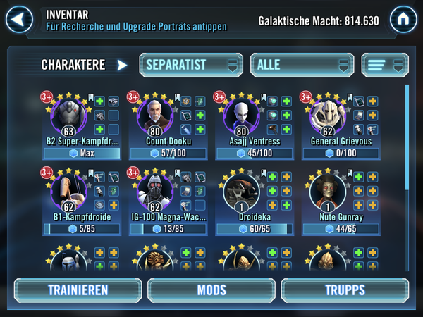Do you guys think this strategy is good or am I just gonna drop down in arena? I will end up having A full separatist team (B1 only 5* for now but with Griveous, Magmaguard, B2), and a Padme team with Fives instead of Obi-Wan and with Yoda, while I am grinding Obi.