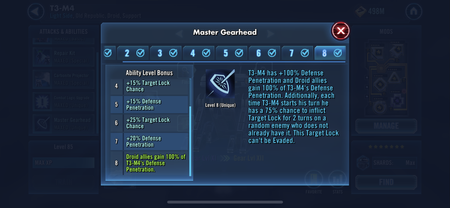 vincentlondon6 years agoT3M4 zeta logicT3M4 2nd zeta says “droid allies gain 100% of T3M4 defense penetration”. But when i look at T3M4 stats he has 0% defense penetration 100% x 0% = 0% So this zeta is completely useless or am i mi...Show More