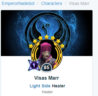 Visas is a dead-end-trap for resources, just like Ugnaught, Lobot and Mob Enforcer. Every single piece of her neccessary gear is wasted. This toon isn't competitive at all. Everyone who invested in her made a mistake, me included. But at the time she was new, many thought that her kit reads great and she could be a valid counter for Nihilus in the Sith-Raid. Such a brainfart. Time showed, that Visas Marr is only one thing: useless.