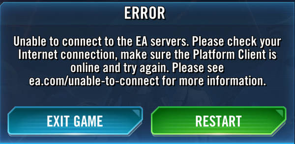 Starting on December 26, 2025, I have not been able to access Galaxy of Heroes on the PC client. I have tried: changing wifi types (5 GHz to 2.4 GHz), restarting the router/router extender, getting a whole new wifi, using wifi at a completely different building, updating to windows 11, deleting and reinstalling the SWGOH app, deleting and reinstalling the EA app, clearing the cache, and looking at the ea.com/unable-to-connect page (I think there were other things I've tried but I don't remember for sure). I even tried asking the ai assistant, but it doesn't know that SWGOH even exists on PC
