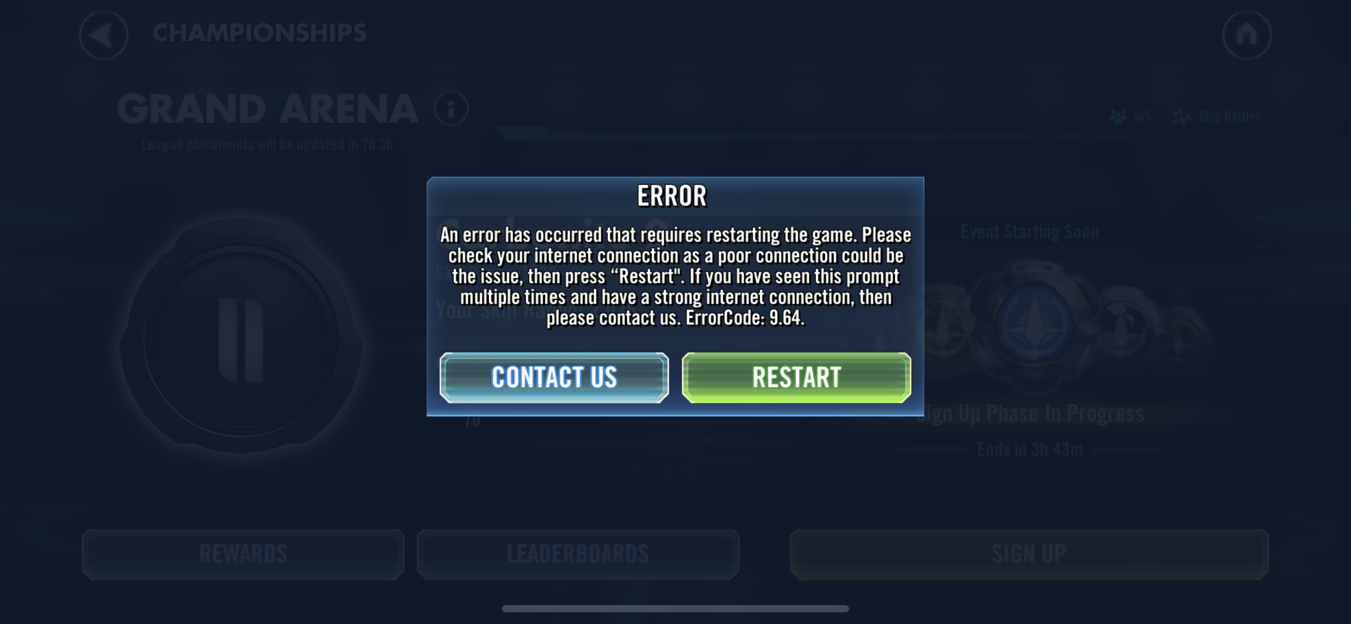 Just like the title, I keep trying to join this next Grand Arena Championship starting in about 3 hours, and everytime I click "Sign Up" it forces a client restart and gives me Error Code: 9 or on another occasion 9.64