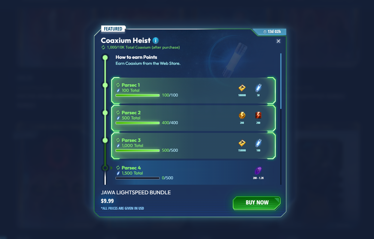 Screen Shot 7 - Showing the different levels for the Coaxium heist event