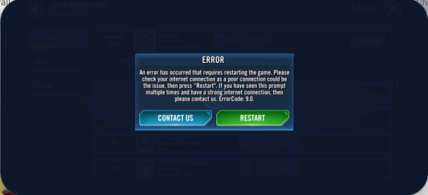 An error has occured that requires restarting the game. Please check your internet connection as a poor connection could be the issue, then press "Restart". If you have seen this prompt multiple times and have a strong internet connection, then please contact us. ERRORCODE 9.0.