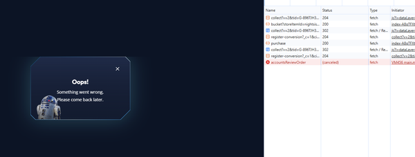 When I attempt to purchase the nightsister LSB on the web store I am greeted with an error splash screen. I've attached screenshots of the console logs and network traffic that occur on click of `Buy Now`