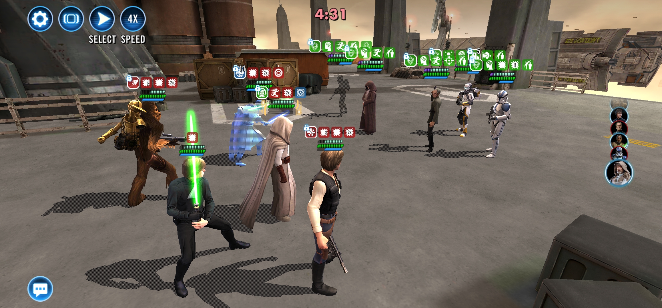 In conquest Hard mode, sector 1 going against Tarkin team, when taking out Knightfall trooper, the game freezes. Tried 3 times already. Basically all the attack buttons disappear, no character does anything, when time runs out it does not save the results and stays on the battle screen, no "defeat" banner appears. Only thing possible to do is forfeit, fix the issue and if possible reimburse for lost energy.