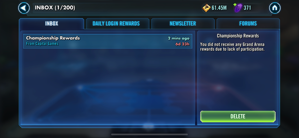 We have released a hotfix to turn off Grand Arena Championships within the next hour. This event will be rescheduled as soon as possible. All end of event and season rewards will not be distributed at the moment (they have been temporarily changed to 1 credit). These rewards will be addressed in a future make good. You can find more details about this issue here.