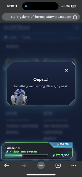 I attempted to purchase the Tusken LSB in the web store but the purchase was cancelled because I went to check something in-game. Now the LSB either doesn’t show up, or when it does, gives me an error when I try to purchase.