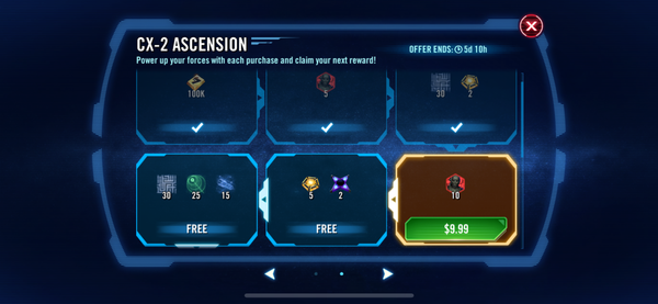 I bought the CX-2 Ascension Pack, which was supposed to unlock additional free tiers. After purchasing the final tier, the pack disappeared completely. Only the character shards were auto-claimed—the rest of the rewards weren’t, and I didn’t even get the chance to manually claim them before the pack vanished.