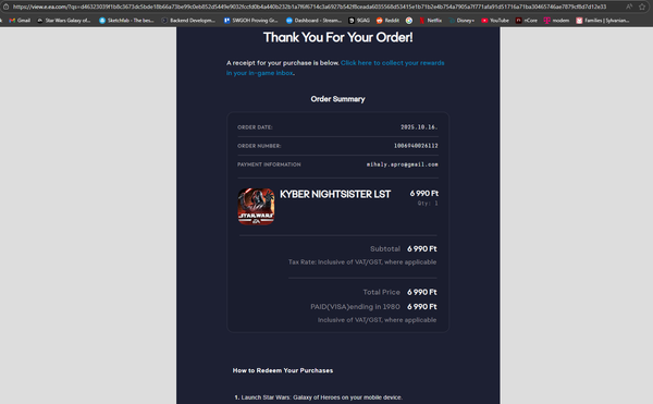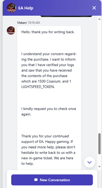 I opened a new ticket a week after via EA HELP but it was closed as "Makam" kindly referred to the order that was actually completed.