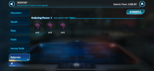 Screenshots below of: bugged TW datacron menu, active datacron inventory, squad arena frozen screen.