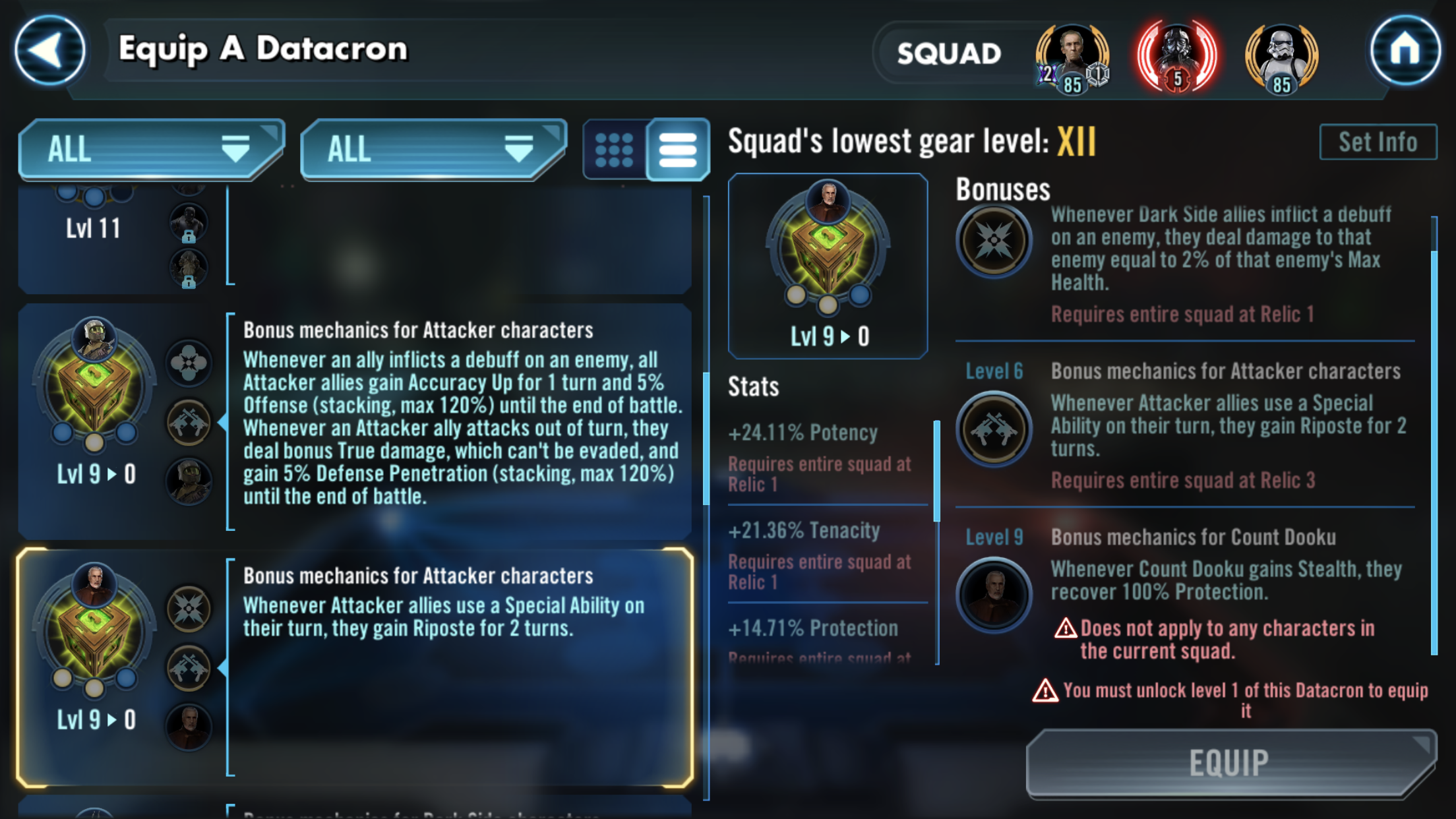 Hi. I'm now missing all of my recent set datacrons instead of just having them reset to level 5. I think this is due to me upgrading the level 5 datacrons after the reset. I am playing on IOS. Please help, I spent a lot of conquest refreshes to get these datacrons. Attached are the photos of the datacrons from my current GAC. I user to have more level 0 ones, but all I want are those level 9s back.