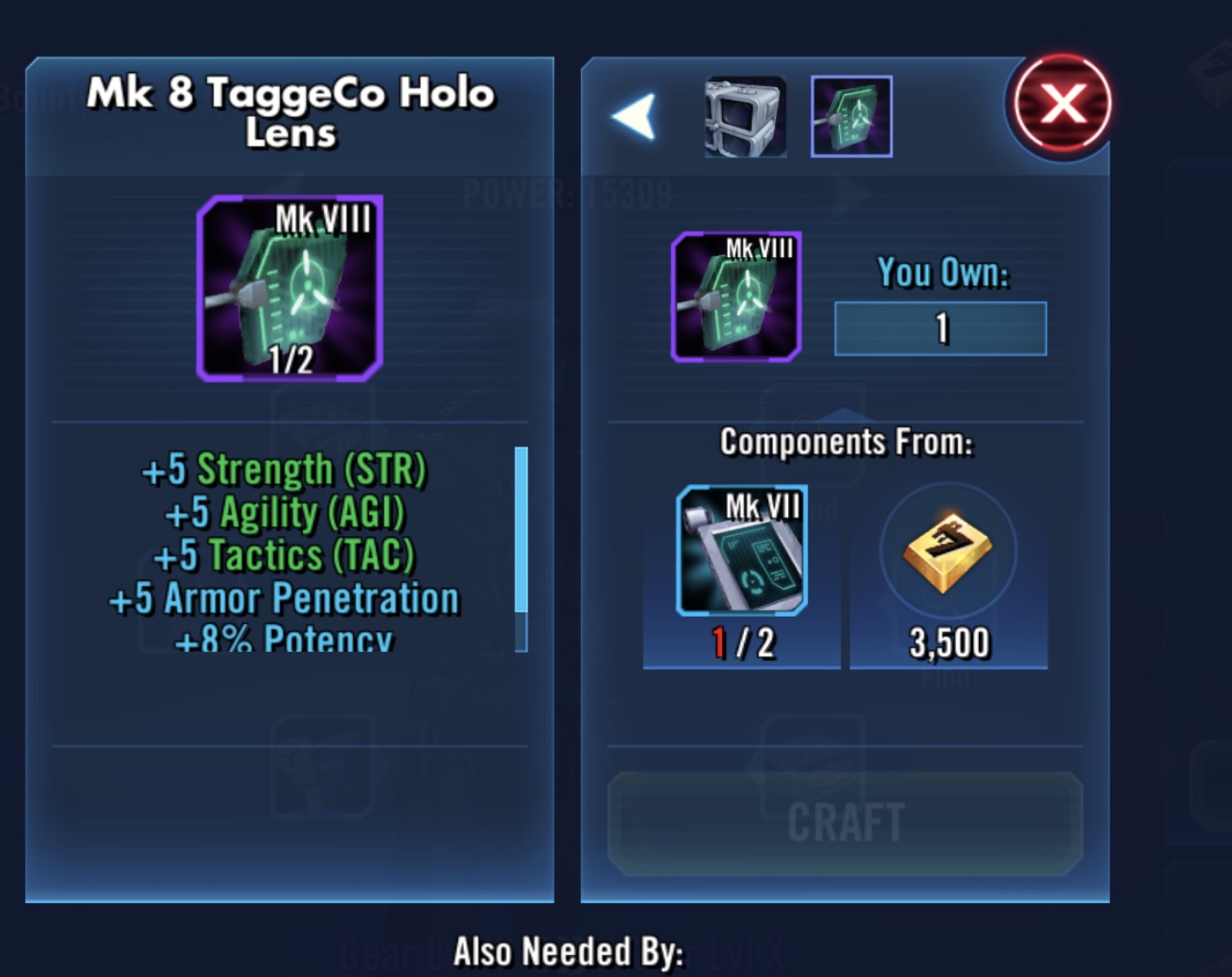 Given that your Cad Bane needed 2 Mk 8 TaggeCo Holo Lens, it sums up to a total of 112 "base" gear pieces which is a lot of grinding.