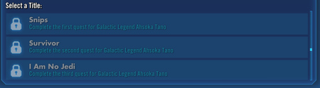 Same problem, Ahsoka is received, but there are no titles. Moreover, several players in the guild received Ahsoka almost simultaneously, some had titles available, some (like me) did not.