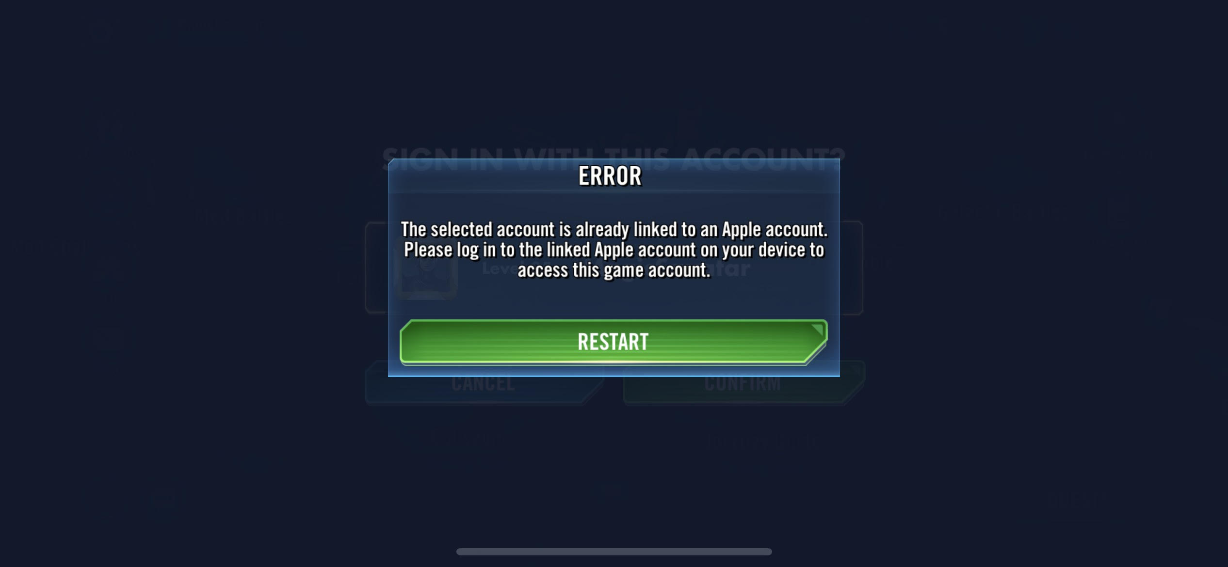 When I opt to import my main account it prompts "The selected account is already linked to an Apple account. Please log in to the linked Apple account on your device to access this game account" However, I am on my Apple account connected to SWGOH for up until this point has been the case for 5 years. I'm forced to restart the game which places me back on the menu for my alternate account.