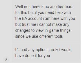 Over the last seven days both the 'in-game help team' and the 'dedicated help team' (accessible through the EA Help site) have bounced me between them and both state they can't do a thing.