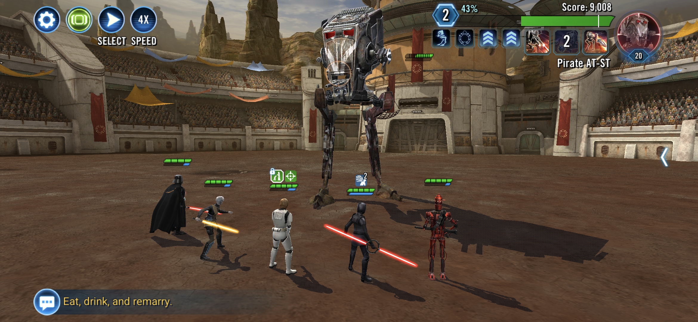 I'm on tier 2 my luke is at 24 and IG90 is 23 this is the second time I've done this battle where the At-st does not take its turn and just sits there i can click on things go to setting and it just sits. I am losing out on attempts. Also after the first time it happened I did restart my game.