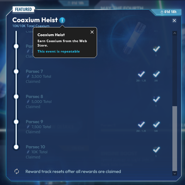 The May 4th Coaxium Heist says the reward track will reset after all rewards are claimed but it isn't resetting, it seems to be stuck, the blue line that normally shows your progress has turned white and is completely full. Can anyone help please? I don't want to miss out on rewards that i'm owed.
