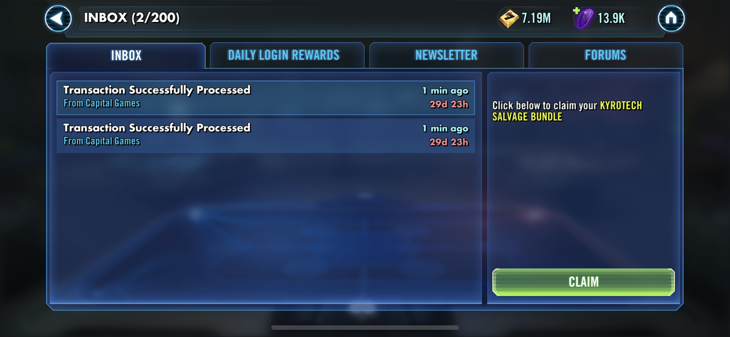 Summarize your bug Missing kyros after purchasing them from webstore and receiving them inbox .i tryed to claim it got an error . i closed the game came back in nothing my inbox they disappeared , i checked my kyros they have not been added . I did the restore purchase through the in game setting . Nothing is working