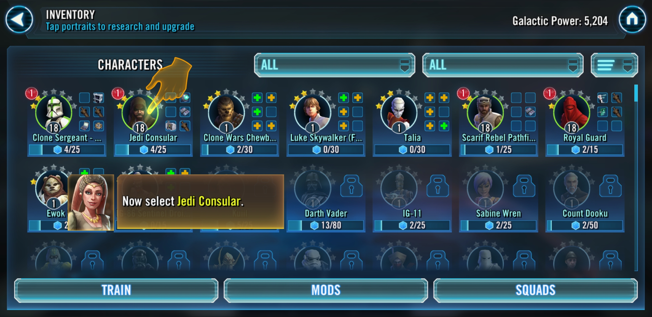 If your account is stuck in the part of the Tutorial where you need to assign Training Droids to Jedi Consular but are unable to because you have more than 1 Training Droid, please provide us with this information to locate your account and investigate the issue: