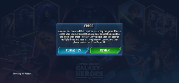 Star wars galaxy of heroes. Error code 3.0, tried restarting phone, clearing app cache and reinstalling game