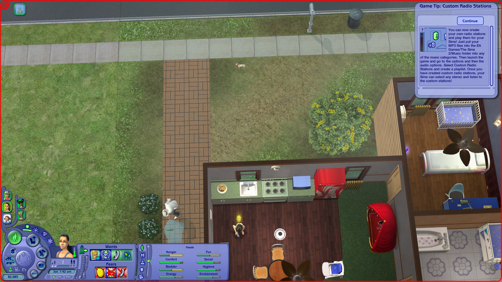 The game tip for custom radio stations references the original game's Documents path (EA Games\The Sims 2) rather than The Sims 2 Legacy's (EA Games\The Sims 2 Legacy).