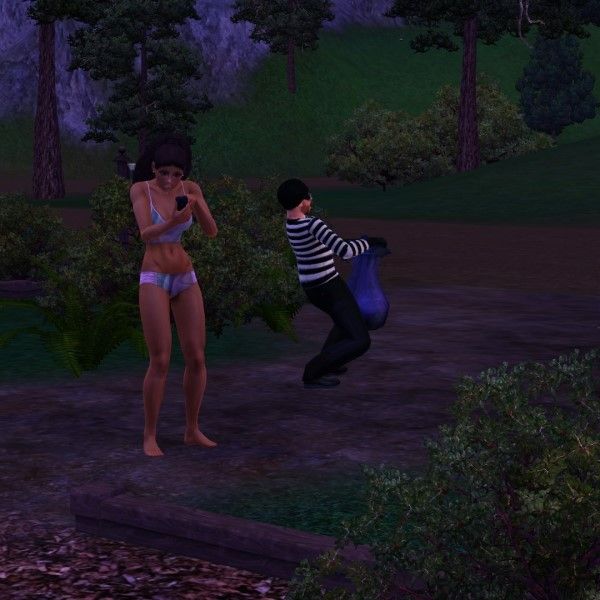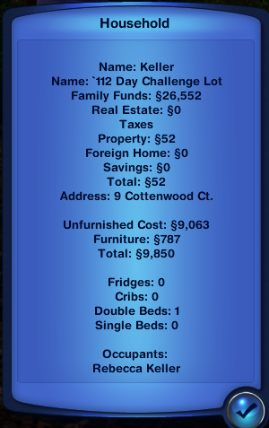 Rebecca started her 112 Day Challenge at 08:00 hrs., Sunday and the first day of Summer. In as little as 68 hours into her challenge, Rebecca awoke to find James Brand in her challenge campsite. By the time she made it outside her tent, James had stolen her bicycle and was in the process of stealing her burn pit and chairs. She didn't even get a chance to fight James (no brave trait, minimal athletics, and no sim-fu ... The game didn't even give her the option). Rebecca was forced to simply watch as she phoned the police for assistance.