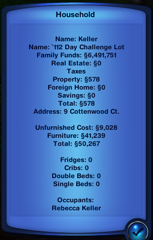 She caught plenty of insects and fish during the week but hasn't sold any of them yet in case she needs them for other efforts later. The roughly 24,000 simoleons she earned in the first week of her challenge, came only from the flowers and seeds she collected and sold ... 🤣😂