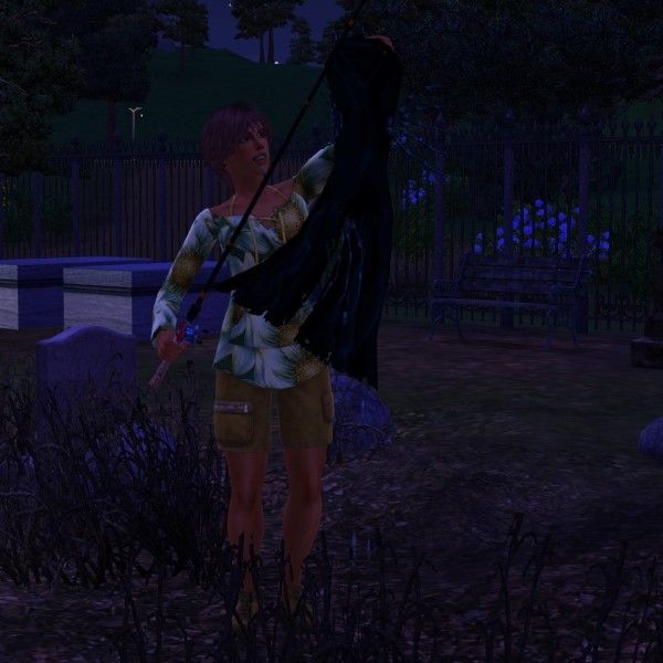 00:00 hrs. - Start fishing for Deathfish with angelfish ... 01:00 hrs - Stop fishing long enough to greet and photograph Ghost ... 05:00 hrs. - Finish fishing, bicycle home, tend garden, eat apple, shower/potty, go to sleep ... 14:00 hrs. - Wake up, pay bills (53 simoleons), eat apple ... 14:30 hrs.- Jog to City Park, finding seeds and photographing landmarks along the way ... 16:45 hrs. - Fish for angelfish with alley catfish ... (17:00 hrs. - Consignment Payout - 395 simoleons, sell photos 153 simoleons) ... 19:00 hrs. - Bicycle home, roast salmon, shower/potty, go to sleep ... 23:00 hrs. - Wake up, ride bicycle to Cemetary, take photos, chat with Blake Grayson.