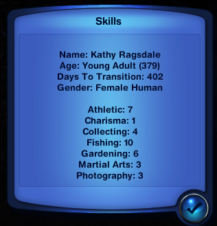Kathy has also spent a lot more time socializing than she had during the Summer and the Fall. Her pumpkin pies are still always a hit at the parties she attends. Kathy also goes out more often clubbing and dancing but has yet to accept a date with any of Hidden Spring's eligible bachelors.