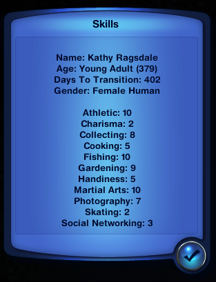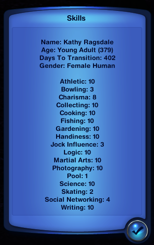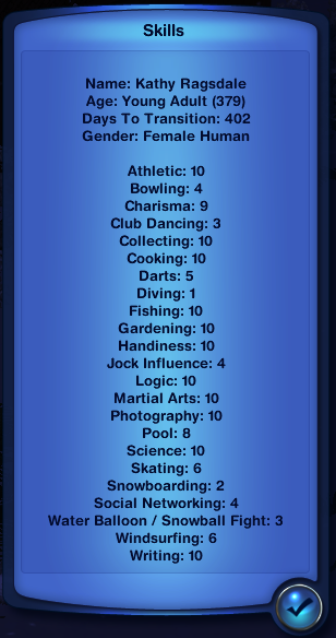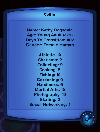 She finished two romance novels, Just Friends (best seller) and Walk in the Rain (hit). At this point she has written six books (no flops, two hits, and one best seller). Kathy has made over 30000 simoleons in Royalties and is currently receiving 17206 simoleons in Royalties a week. She has also achieved the writing skill challenges becoming a Speed Writer and Romance Novelist. This makes writing novels faster, and with more hits or best sellers if they romance novels.