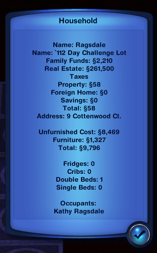 Currently, Kathy Ragsdale's lot is 30x40 - 9 Cottonwood Ct. ~ Hidden Springs. With all the adjustments, added landscaping, and a few items it costs 13,416 simoleons. Note that adding trees and bushes, landscaping timbers, and fencing increases the price and value of the lot. That will affect your Challenger's starting money and bills.