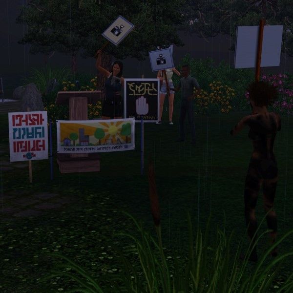 One of the great things about the challenge and living outside, is when you can hear folks protesting in the park next to your lot during a thunderstorm and show up in time to notice Jessica Willow got struck by lightning waving her sign around.