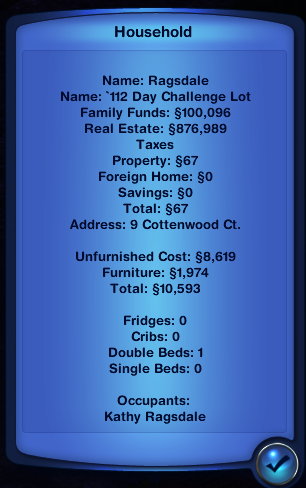 Net Worth: Kathy has 595 simoleons in her bank account ... And 461552 simoleons in investments and property ... 🤣
