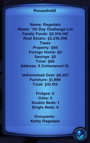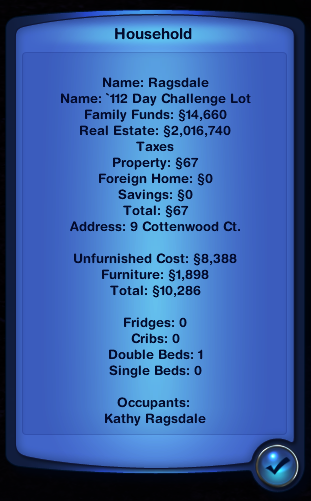Net Worth: 28447 simoleons ... Kathy is also invested as a Partner with two businesses (13000 simoleons - Redeemable, for those who don't know how investments work, The Challenger is just 'parking' their money in investments during the Challenge because that will earn them more money. They don't need money for anything [other than bills that pale in comparison and buying the Ambrosia Recipe] and they have to sell all their investments at the end of the Challenge.)