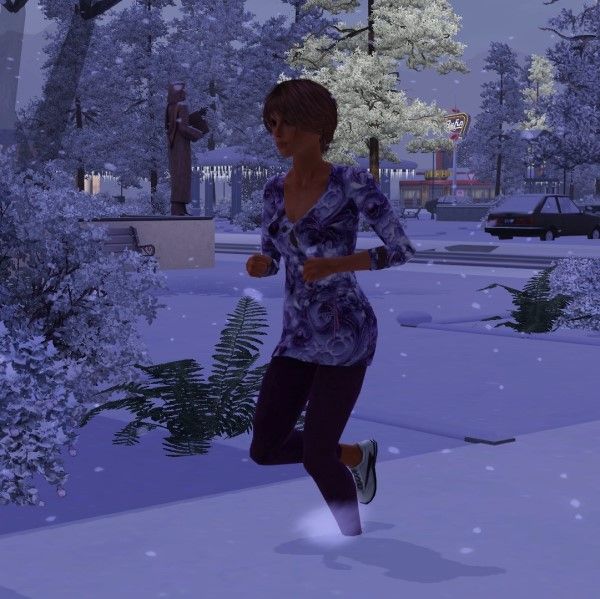 The season of jogging ... Kathy has been staying in shape and working on her challenges in Athletics. She has already achieved the Marathon Runner Challenge and is working on the Fitness Nut Challenge. She has more time on her now since gardening is out of the picture, and she has reduced her profit-making endeavors to a trickle (she is planning on stopping her career as a writer when she finishes her current novel). Not counting her investments or royalties, Kathy has more than 1.3 million simoleons in her bank account and will easily break Chris Harper's 112 Day Challenge record for money earned by the end of the challenge.