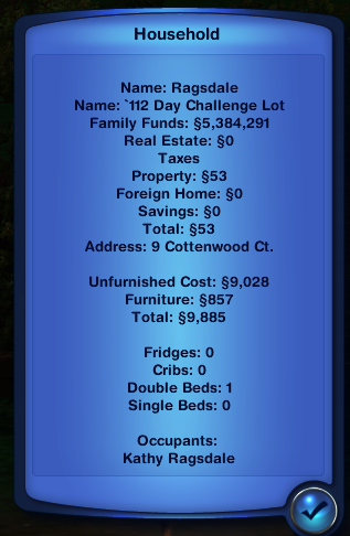Currently, Kathy Ragsdale's lot is 30x40 - 9 Cottonwood Ct. ~ Hidden Springs. With all the adjustments, added landscaping, and a few items it costs 13,416 simoleons. Note that adding trees and bushes, landscaping timbers, and fencing increases the price and value of the lot. That will affect your Challenger's starting money and bills.