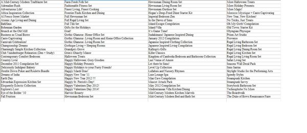Generations, Seasons, Late Night, Ambitions, World Adventures, University Life, Island Paradise, Pets, Showtime, Supernatural, High-End Lofts, Master Suite, 70's 80's & 90's, Midnight Hollow, Roaring Heights, Hidden Springs, Sunlit Tides, Lucky Palms and Riverview