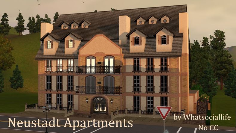 whatsociallife , I really like the looks of the exterior on your Neustadt Apartments - great architectural features. And the section that has the arched look in the upper middle area turned out good. I like the way the flooring came out on your main floor; I'm always hesitant to use that store flooring from Midnight Hollow not knowing what it would get replaced with if someone didn't own it, lol. And lovely how you created the shelving area that flanks the fireplace in the living room. Nicely laid out and decorated too. Very nice apartment!