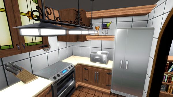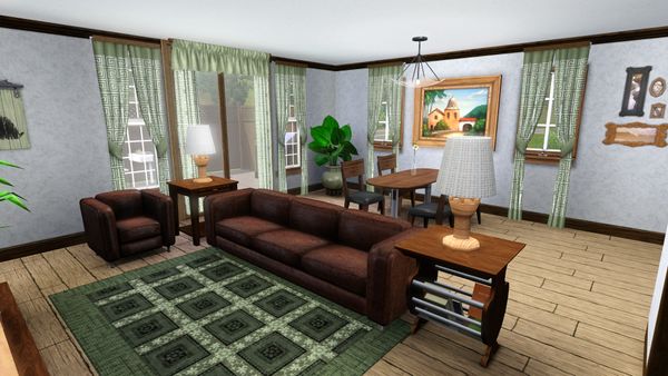 A completely furnished 2-story townhouse is ready for your sim family to move into. The exteriors are in the typical medieval half-timbered brightly painted facades. The yellow house is the one furnished and has a two-car garage with a laundry area, 3 bedrooms (two are kids' rooms) and 2 bathrooms, and a computer nook and bookcase on the 2nd floor landing. It has a fenced in side entrance to the front door, along with a small patio equipped with seating, a BBQ and chess table. Everything is upgraded as usual.