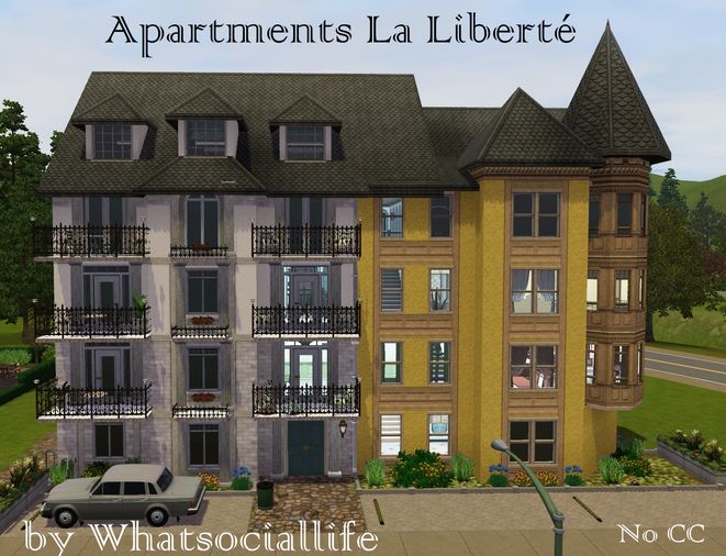 Apartment block facilities include a gym, underground pool and laundry area. I've had trouble with setting npc doors - only half of them would accept it. There will be people, just not as many. It has a proper front door, set as front. I don't understand why but that's Sims 3 for ya! Place at 544 Rue Bartholdi.