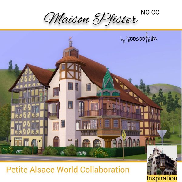 Woot, so glad I finally wrapped up the decor on this one. As usual, I've kept the store items minimal and only loaded up the EPs I tend to use more often. It's a large house but my tester sims seem to manage it quite well. I would probably remove the keg for my own gameplay since they seem to like that way way too much lol. Anyway, here is Maison Pfister, inspired by the historic home. Place at (A12) 41 Grand Rue.
