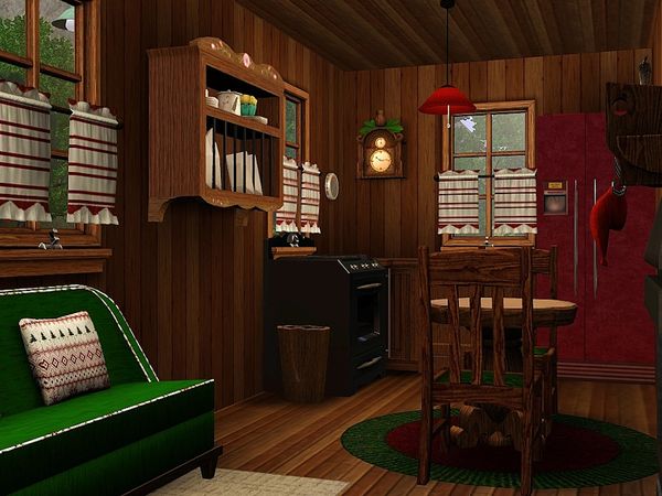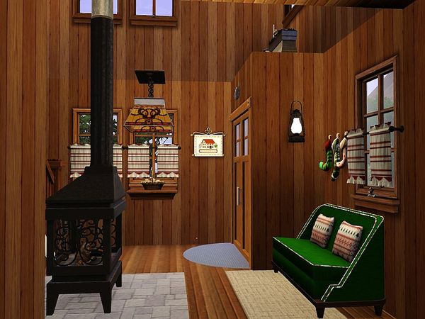 A tiny Alpine chalet imagined as a romantic getaway for a couple of Sims to come back to after a day of skating and snowboarding (since there is no skiing in the sims 3 world). The ground floor is the kitchen/dining/living area, with a small bathroom. The loft is the sleeping area.