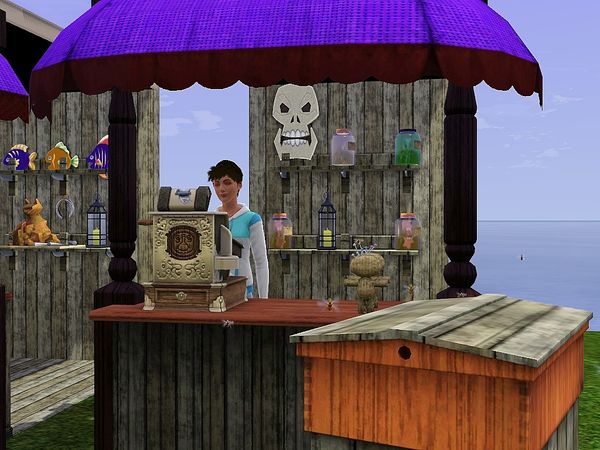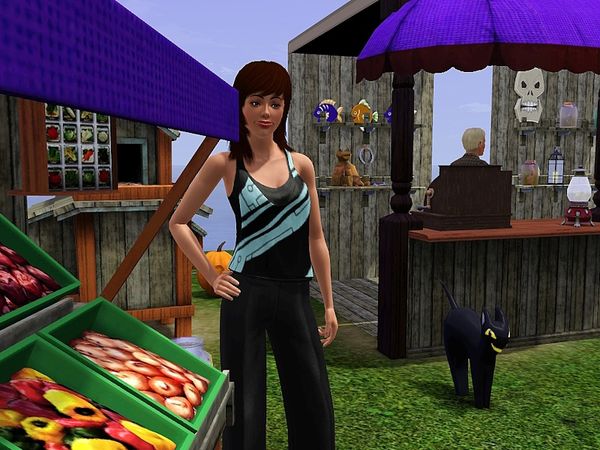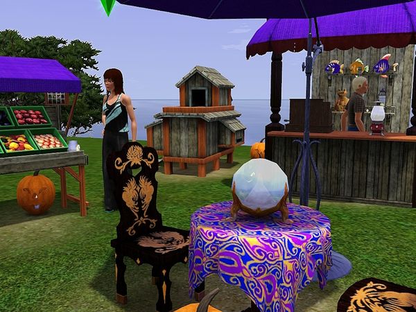Besides the pumpkin lamp, black cat sculpture and wall skull from the Halloween sets, I used the Voodoo doll and fortune-telling table from the Store.