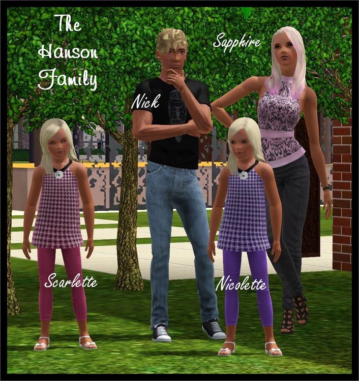 Meet the Hanson Family -- Dad Nick is a skater boy and Mom Sapphire is a model type and they have twin daughters, Nicolette and Scarlette. (This was a D.N.A. request)