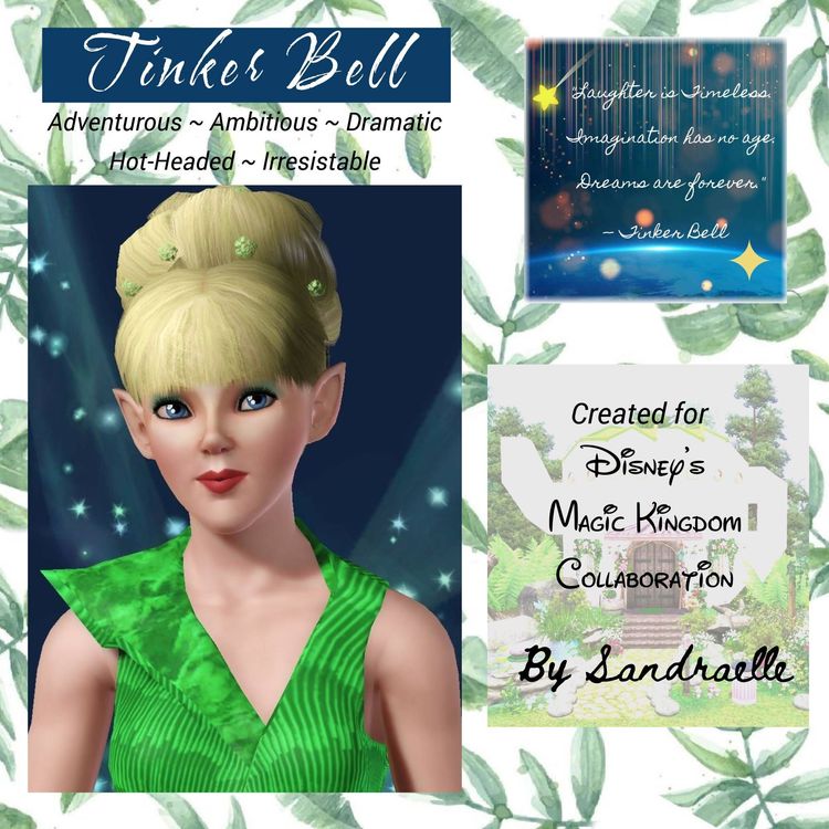 A trail of pixie dust was known to follow Tinker Bell around when she was living in Pixie Hollow, but moving to the Magic Kingdom she will spread her charm and magic instead. She is adventurous, ambitious, dramatic, hot-headed, and irresistible. She likes soul music, key lime pie, her favorite color is Irish green and her sign is Virgo. Her lifetime wish is to become a Great Explorer. (Created for Disney's Magic Kingdom Collaboration)