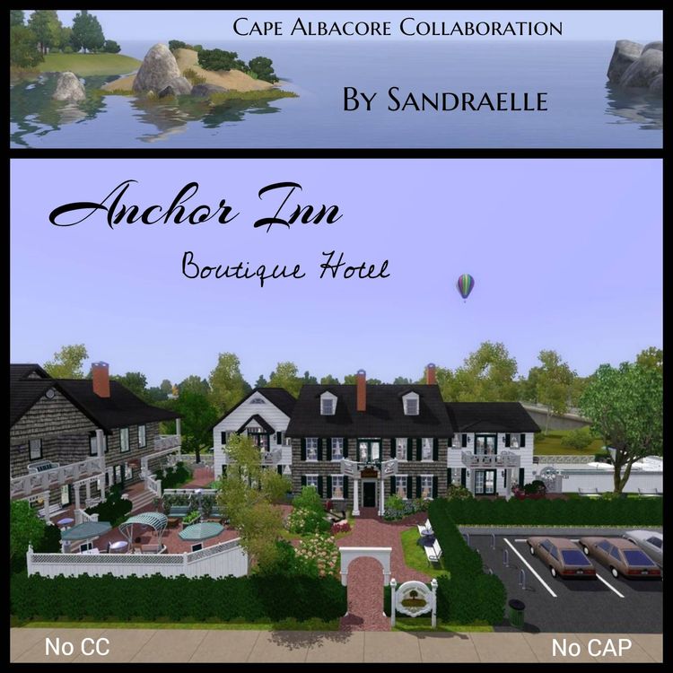 Charming historical boutique hotel built for your simmies to enjoy. Basement resort towers and 9 private guest rooms, each uniquely decorated in period-style furnishings, plus patios, bar, buffet restaurant, library, fitness center, pool, hot tub and horseshoes. Inspiration for this hotel came from several different real hotels located on Nantucket Island in Massachusetts. :) AND, yay Me....I only used 2 items from the store, a very rare thing in my builds, haha!