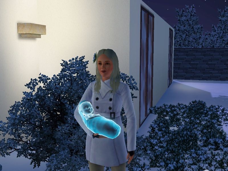 Jupiter and Benjamin both have the "It's a girl" moodlet, with about 9 hours left to go. I can see the baby in their family trees; she is a vampire ghost called Malinda...but she is nowhere else to be found. She isn't on the family side bar or in the list of the knows Sims for Jupiter, Benjamin or their older son, Lee. Neither of the adults have Malinda's gravestone and it isn't at the graveyard either.