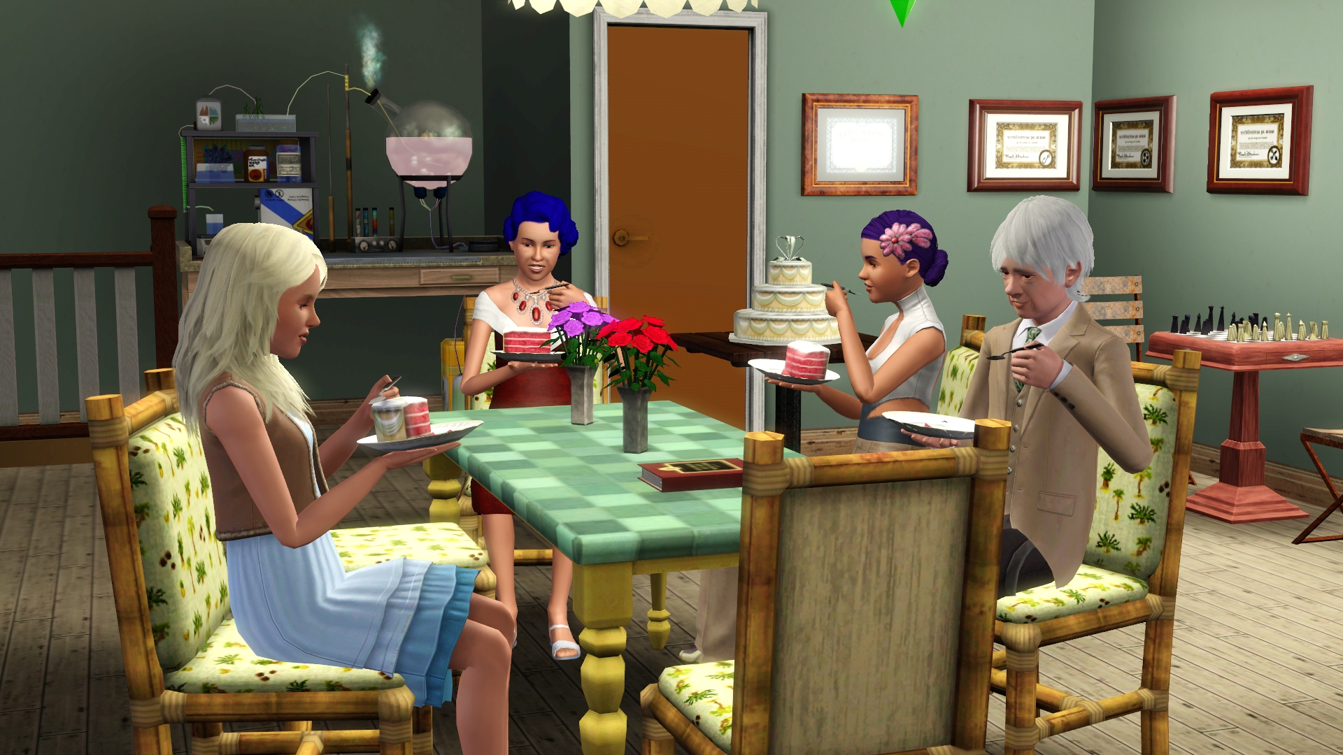 Skills area with a chess table and chemistry station: